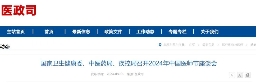 8月16日,国家卫生健康委会同国家中医药局、国家疾控局在京以电视电话会议形式召开2024年中国医师节座谈会,向全国广大医务人员致以节日问候。国家卫生健康委党组书记、主任雷海潮出席会议并讲话。